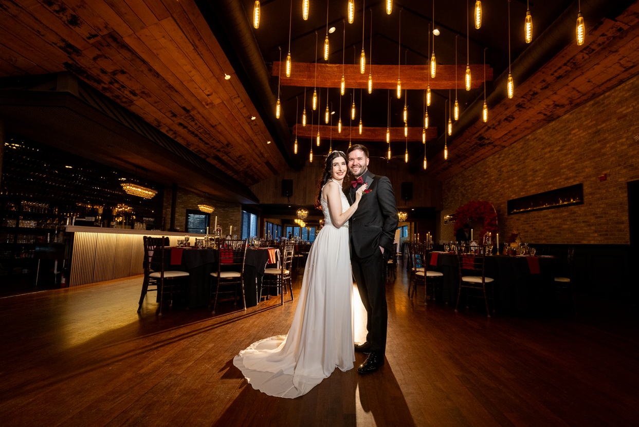 The updated room blends rich hardwoods, exposed brick, and refined lighting to create a warm, modern space that feels both intimate and striking—perfect for couples seeking something unexpected.